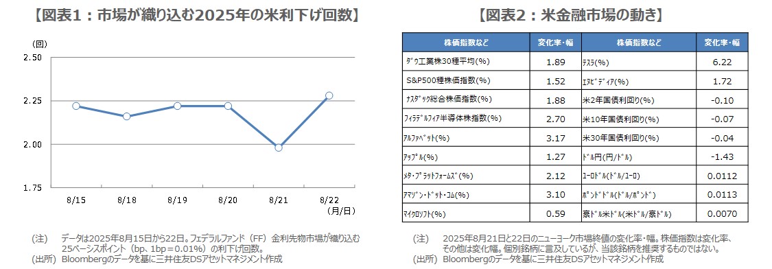 8月22日の米国金融市場は、「政策スタンスの調整を正当化する可能性」との発言を9月の利下げ示唆と受け止めた模様で、年内の利下げの織り込みが進み(図表1)、長期金利低下、ドル安、株高の反応となりました(図表2)。ただ、パウエル議長は、データに基づいて政策を判断する姿勢から「決して逸脱しない」とも強調しており、改めて8月分の米雇用統計と消費者物価指数(それぞれ9月5日、11日に発表)の見極めが必要と考えます。