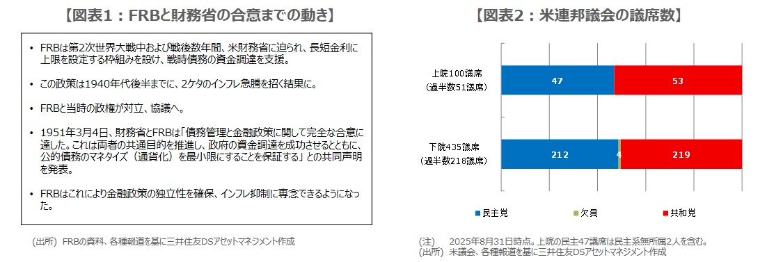 寄稿でも触れられていましたが、FRBは第2次世界大戦中および戦後数年間、米財務省に迫られ、長短金利に上限を設定する枠組みを設け、戦時債務の資金調達を支援した経緯があります。しかしながら、この政策は1940年代後半までに、2ケタのインフレ率上昇を招く結果となりました。FRBと財務省は協議を重ね、1951年3月に政府債務管理と金融政策を分離する合意に達し(図表1)、FRBは金融政策の独立性を確保できるようになりました。