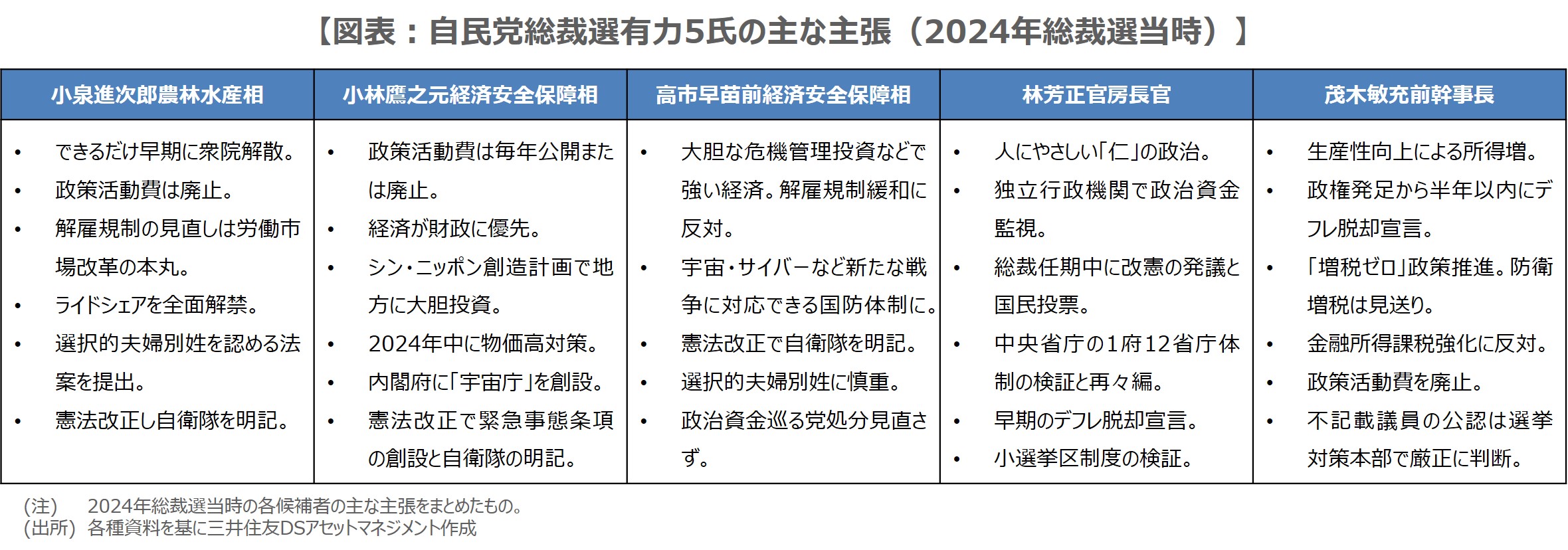 ここまで名前をあげた5名は、昨年の総裁選にも立候補しており、その時の主な主張は図表の通りです。現在、物価高が続くなか、日銀は利上げ局面にあり、米関税政策は日米合意で不透明感が後退しています。また、消費税減税について、自民党は7月の参議院選挙で公約とせず、麻生太郎最高顧問は9月3日、消費税減税に否定的な考えを示しました。総裁選候補者はこれらの状況を踏まえ、今後、政策方針を公表するとみられます。