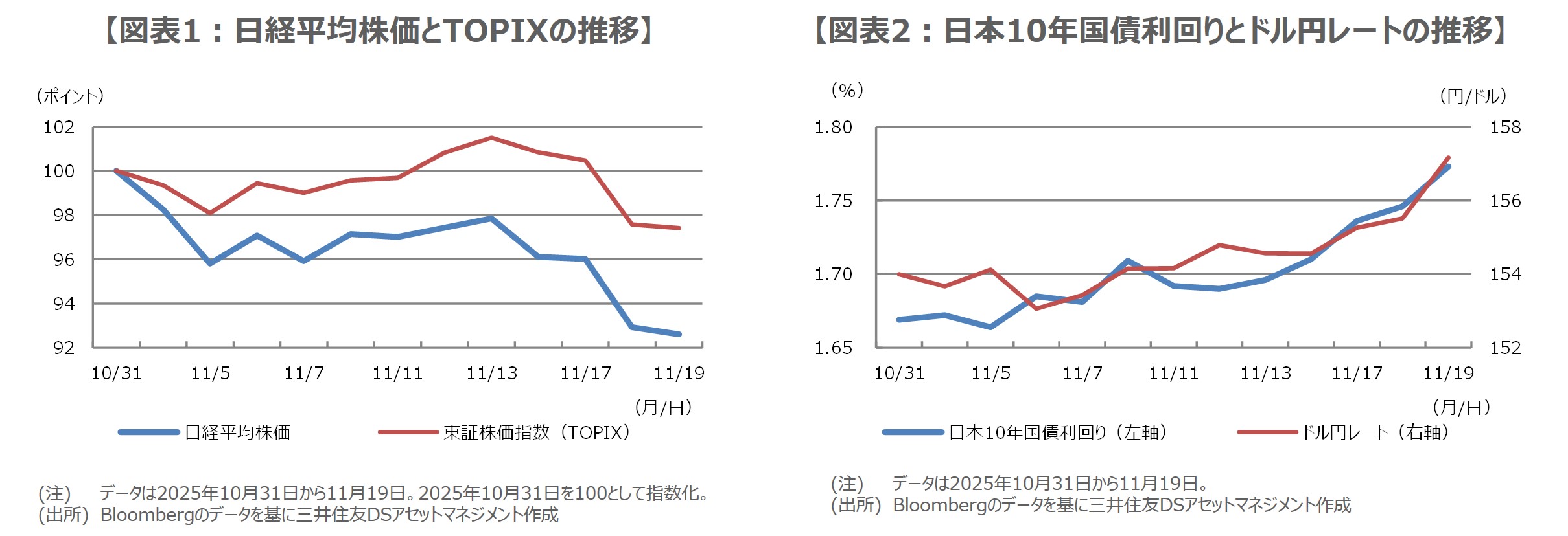 足元の日本市場では、株、国債、円がそろって売られる「トリプル安」の動きがみられます(図表1、2)。以下、この背景と今後の注目点について考えます。まず、株について、日経平均株価は終値ベースで過去最高値をつけた10月31日から11月19日までの期間、3,873円64銭(7.4%)下落しましたが、特に目立って下げを主導したのは、ソフトバンクグループ、アドバンテスト、東京エレクトロンの値がさ株3銘柄です。
