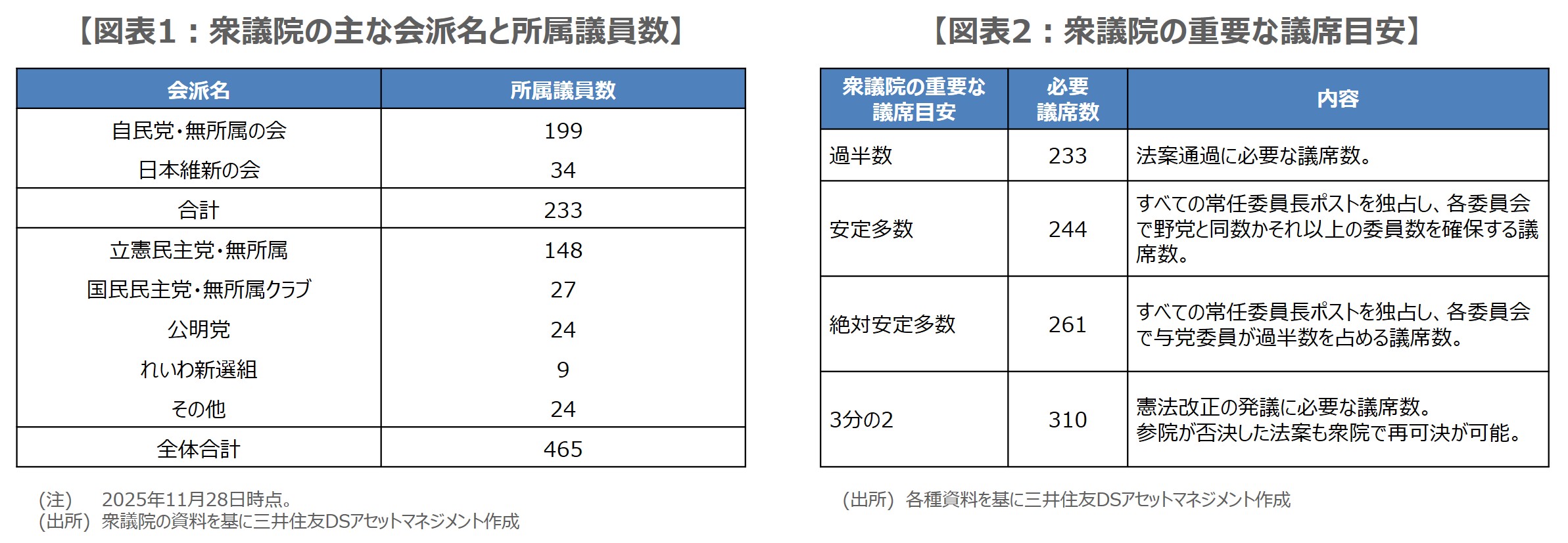 衆議院の主な会派と所属議員数をみると(図表1)、2025年11月28日に「改革の会」を組む無所属の国会議員3名が自民党の会派に合流したことで、自民党は199名となっており、日本維新の会の34名を合わせると与党は233名で、衆議院の過半数(233議席)に達しています。仮に解散総選挙となった場合、「安定多数(244議席)」、「絶対安定多数(261議席)」、「3分の2(310議席)」が議席数の目安になります(図表2)。