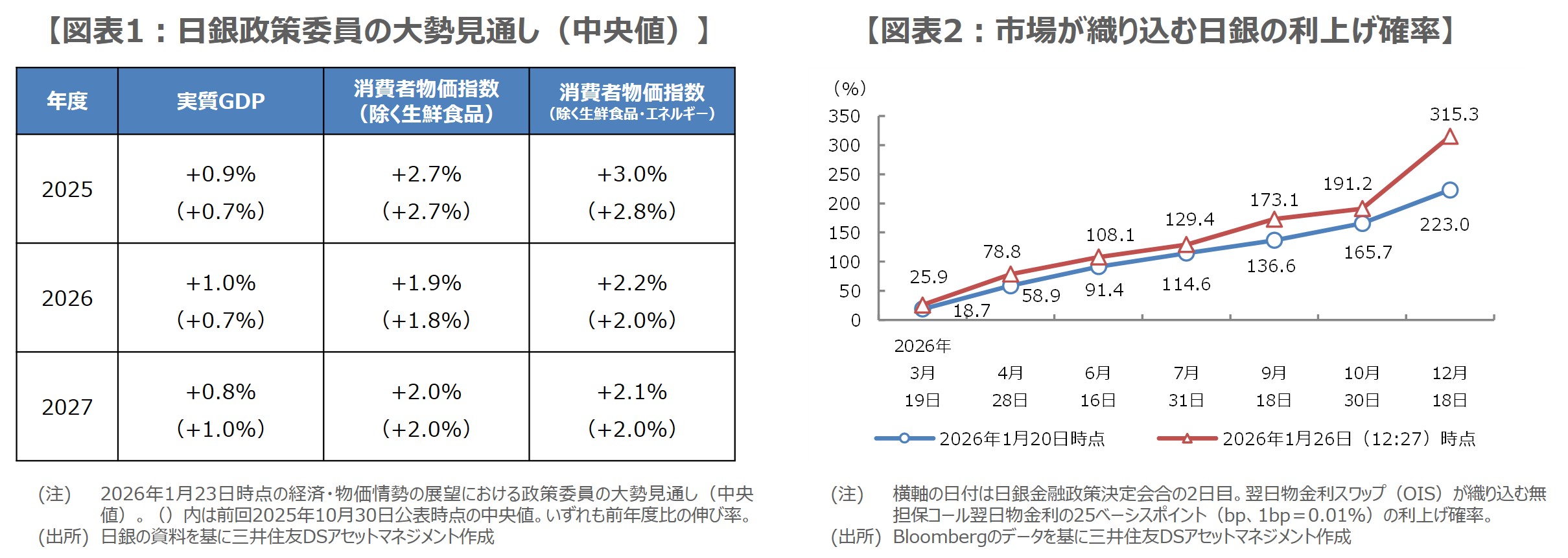 同時に公表された展望レポートでは、実質GDPの見通しと消費者物価指数の見通しが総じて上方修正されるなど、ややタカ派的な内容となりました(図表1)。リスクバランスは、経済・物価いずれの見通しも、おおむね上下にバランスしているとし、2026年度の経済見通しは下振れリスクの方が大きいとの前回評価は修正されました。また、物価安定の目標の達成時期は、見通し期間後半との見方が維持されました。