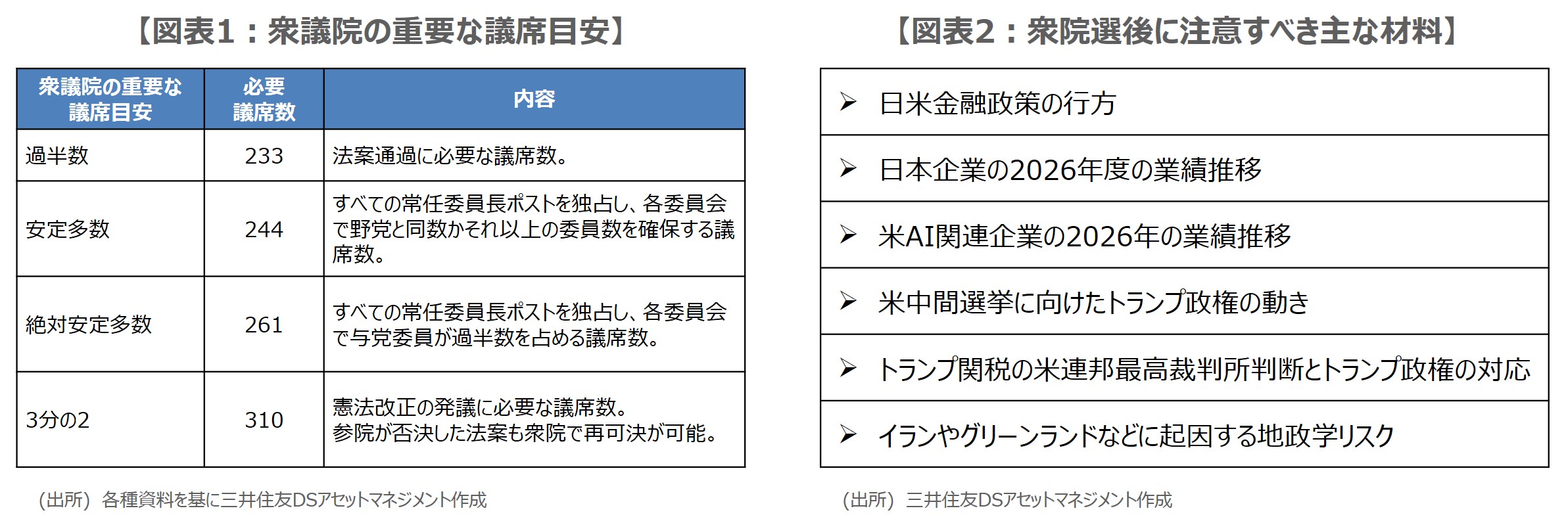高市早苗首相は衆院選の勝敗ラインとして「与党で過半数」を掲げており、報道各社の終盤情勢を踏まえると、与党圧勝の可能性も意識されます。なお、衆議院の定数は465議席であり、重要な議席数の目安は図表1の通りです。仮に、与党が3分の2の310議席を確保した場合、与党は憲法改正の国会発議や、参議院が否決した法案の衆議院での再可決が可能となります。