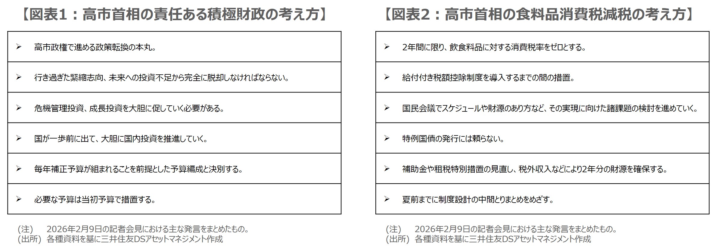 高市早苗首相は2月9日、前日に投開票が行われた衆議院議員選挙の結果を受け、自民党本部において党総裁として記者会見を行いました。市場では、与党圧勝となった今回の衆院選を経て、高市首相が「責任ある積極財政」について、改めてどのような考えを示すのか、また、食料品の消費税減税について何を語るのか、注目が集まっていました。以下、記者会見での高市首相の発言を踏まえ、それぞれポイントをまとめていきます。
