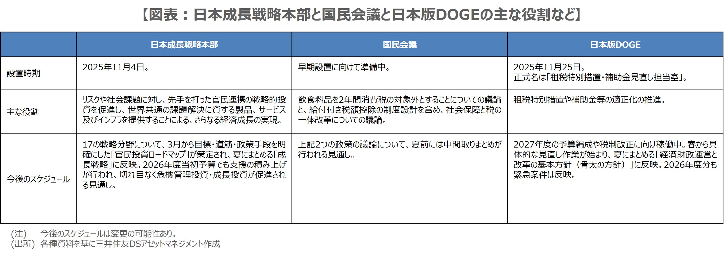 なお、飲食料品が消費税の対象外となれば、年5兆円程度の税収減となるため、日本版DOGEが安定的な財源をねん出できるか否かが注目されます。改めて、高市政権における日本成長戦略本部と国民会議、日本版DOGEの役割などをまとめると図表の通りとなります。今後、それぞれの組織で議論が着実に進展すれば、国内金融市場における持続的な株高と、投機的な円安や長期金利上昇の抑制につながると思われます。