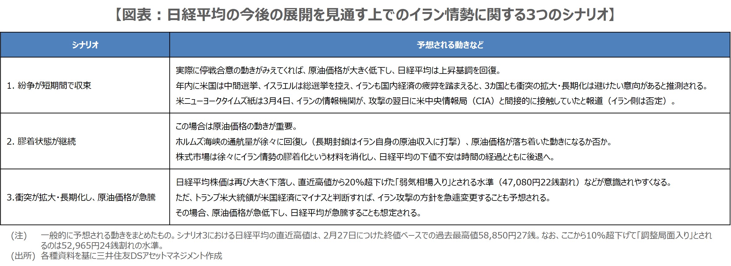 以下、日経平均の今後の展開について、イラン情勢に関する3つのシナリオで考えてみます(図表)。1つ目は、紛争が短期間で収束するシナリオです。年内に米国は中間選挙、イスラエルは総選挙を控え、イランも国内経済の疲弊を踏まえると、3カ国とも衝突の拡大・長期化は避けたい意向があると推測されます。実際に停戦合意の動きがみえてくれば、原油価格が大きく低下し、日経平均は上昇基調を回復する展開が予想されます。