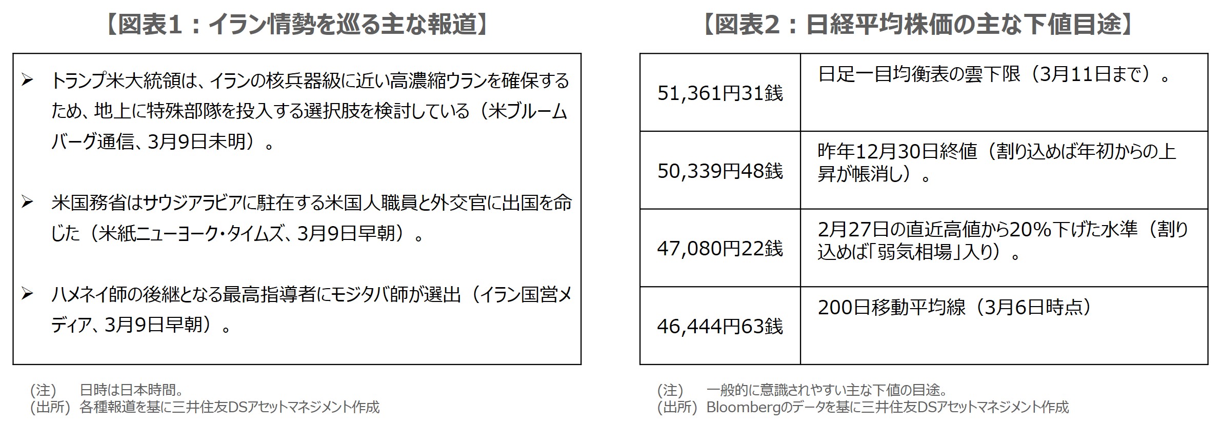 日経平均株価も3月9日は寄り付きから大きく値を崩しています。改めて日経平均の下値目途について考えた場合、テクニカル分析では日足一目均衡表の雲下限の51,361円31銭(3月11日まで)、昨年12月30日終値の50,339円48銭(割り込めば年初からの上昇が帳消し)、2月27日の直近高値から20%下げた47,080円22銭(割り込めば「弱気相場」入り)などが意識されやすいと思われます(図表2)。