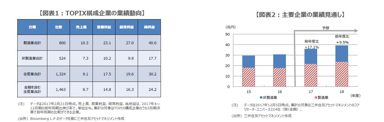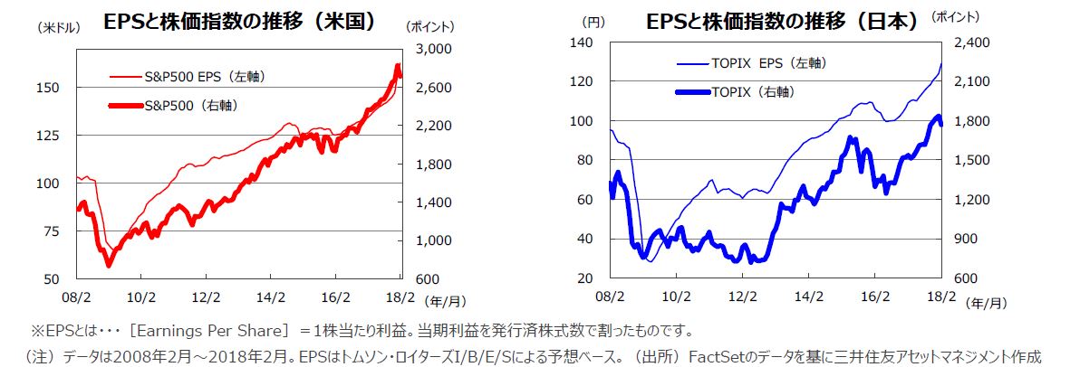 S&P500指数の18年2月の1株当たり予想利益(EPS)は162.43米ドル(前年同月比+21.1%)と、17カ月連続で過去最高を更新し、かつ3カ月連続で前年同月比二桁の伸びとなりました。東証株価指数(TOPIX)の予想EPSは128.97円(同+18.2%)と、9カ月連続で二桁の伸びとなりました(いずれも予想はトムソン・ロイターズI/B/E/Sベース)。