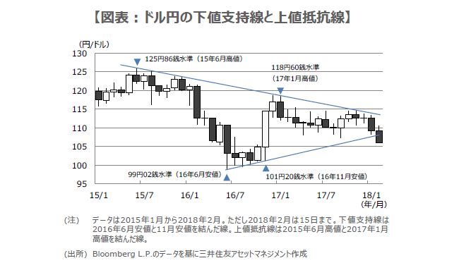 年初から1月下旬までは、世界的な株高が続くなか、為替市場ではドルが対主要通貨で下落する「ドル安」の動きが顕著となりました。その後、1月下旬から2月上旬にかけて、米長期金利の上昇を受け主要国で株価が大幅に調整すると、リスク回避の「円高」と、ドル安の巻き戻しによる「ドル高」が発生しました。2月中旬に入り、主要国の株価が徐々に落ち着きを取り戻すと、為替市場では再び「ドル安」の動きがみられるようになりました。このように整理すると、年初から足元までは、基本的に株式などリスク資産の上昇を伴うドル安相場が続いていると判断できます。ただし、途中の大幅な株価調整で、一時的なリスク回避の円高が発生し、これが結果的に、ドル安・円高の勢いを加速させたと考えられます(図表)。
