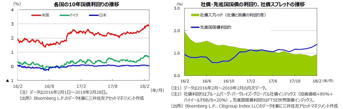 2月末の米国10年国債利回りは、前月末に比べ上昇しました。1月の平均時間給や物価関連指標の上振れ等により、利上げのペースが加速するとの見方が強まったためです。ドイツ10年国債利回りは、世界的な株価急落に加え、イタリアの議会選挙や、ドイツの連立政権樹立の是非を巡る社会民主党の党員選挙を控えての不透明感の強まりから、低下しました。日本では、米金利上昇への警戒感が強まるものの、株価の急落に加え、黒田総裁再任を柱とする日銀の人事案公表を受けて台頭した金融緩和策維持との観測が、10年国債利回りを押し下げました。他方、米国社債については、国債とのスプレッドが小幅に拡大しました。