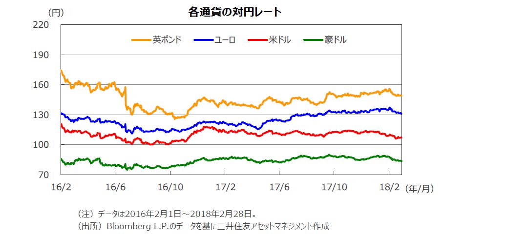 2月の円の対米ドル相場は、1月下旬のムニューシン米財務長官によるドル安容認発言等を受けてのドル安の流れに、株価急落を受けたリスク回避の円買いの動きが重なり、円高米ドル安が加速しました。対ユーロでも、リスク回避的な円買いの動きが強まったため、円高が進行しました。ドイツやイタリアの政局への警戒感により、ユーロ買いを控える動きがあったことも影響したと見られています。豪ドルの対円相場は、17年10-12月期の豪州の消費者物価上昇率が市場予想を下回り、豪州準備銀行(RBA)による利上げの観測が後退したこと等から、下落しました。