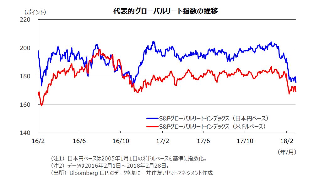 グローバルリート市場は、米国の長期金利上昇を受け下落しました。為替効果はマイナスに寄与し、円ベースの月間下落率はドルベースの下落率を上回りました。