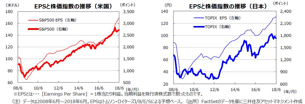 S&P500種指数の18年6月の1株当たり予想利益(EPS)は168.84米ドル(前年同月比+21.3%)と、20カ月連続で過去最高を更新し、かつ8カ月連続で前年同月比二桁の伸びとなりました。東証株価指数(TOPIX)の予想EPSは131.31円(同+17.2%)と、13カ月連続で二桁の伸びとなりました(いずれも予想はトムソン・ロイターズI/B/E/Sベース)。