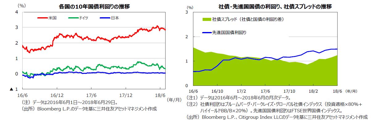 6月の米10年国債利回りは、5月の雇用統計をはじめ景気指標が総じて良好な内容だったことや、パウエルFRB議長の「政策金利は依然として緩和的な水準、緩やかな利上げを継続する根拠は強い」といったタカ派的発言等を受け上旬に上昇しましたが、下旬は米中間の貿易摩擦激化の懸念が再浮上してきたこと等からリスク回避の動きが強まり低下。結局、6月末は前月末に比べほぼ横ばいで引けました。欧州では、ECBが利上げの時期は19年の秋以降になるとのガイダンスを行ったことから、ドイツの国債利回りは低下しました。米国の社債については、国債との利回り格差が前月末に比べ小幅に拡大しました。