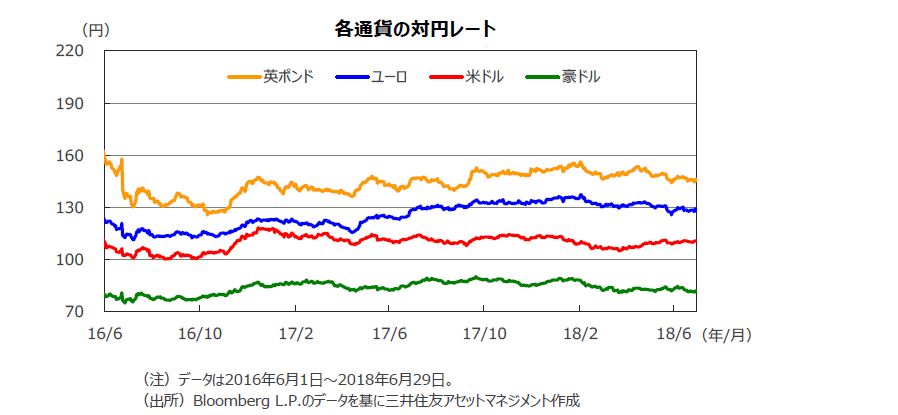 6月は、円が米ドル、ユーロといった主要通貨に対して下落しました。良好な米経済を背景にFRBによる利上げ加速の観測が浮上したこと、ECBが6月の理事会で資産購入プログラムの年内終了を決定したこと等によるものです。一方で、知的財産権侵害を巡る問題からトランプ米政権が対中制裁関税の発動を発表するなど、米中貿易摩擦が激化する恐れが強まったことが、米ドルの上値を抑えました。他方、豪ドルは円に対して下落しました。豪州の主要な貿易相手国である中国と米国との間の貿易摩擦懸念や、鉄鉱石価格の下落等が、その要因です。