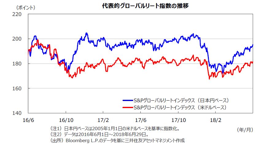 6月のグローバルリート市場は、世界景気の順調な拡大を支えに上昇しました。為替効果がプラスに寄与したため、円ベースの月間上昇率はドルベースの上昇率を上回りました。
