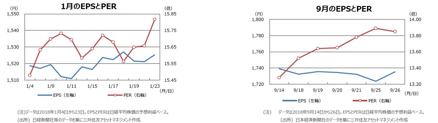 日経平均株価は終値でみると、1月4日に23,000円台を回復した後、12営業日後の1月23日に24,000円台を回復しました。一方、足元の日経平均株価も終値でみると、9月14日に23,000円台を回復した後、6営業日後の9月26日に24,000円台を回復しました。つまり、23,000円台から24,000円台に乗せるまでの上昇ペースは、今回の方が速かったことになります。次に、日経平均株価を予想利益ベースの1株当たり利益(EPS)と株価収益率(PER)に分け、1月4日から1月23日までの期間と、9月14日から9月26日までの期間の推移を確認します。下図をみると、1月も9月も、業績を反映したEPS主導の株高ではなく、期待を反映したPER主導の株高であることが分かります。1月の日経平均株価は、その後3月にかけて、調整局面に入りました。そのため、足元の株高も、上昇ペースが1月よりも速い分、反動の大きさが懸念されます。しかしながら、今回の24,000円台回復と、1月の24,000円台回復では、大きな違いがあります。それは、EPSとPERの水準です。1月23日時点では、日経平均株価の予想利益ベースのEPSは1,525円、PERは15.82倍でした。この時の過去3年平均のPERは15.13倍です。これに対し、9月26日時点ではEPSが約1,735円、PERは13.85倍、過去3年平均のPERは14.43倍となっています。したがって、9月の株高は、利益予想に対して割安な株価水準の修正とみることができ、少なくとも1月のような大幅調整への懸念は不要と考えます。10月下旬からの中間決算発表で、業績予想の上方修正が顕著にみられれば、EPS主導で日経平均が一段高となる余地は広がるとみています。