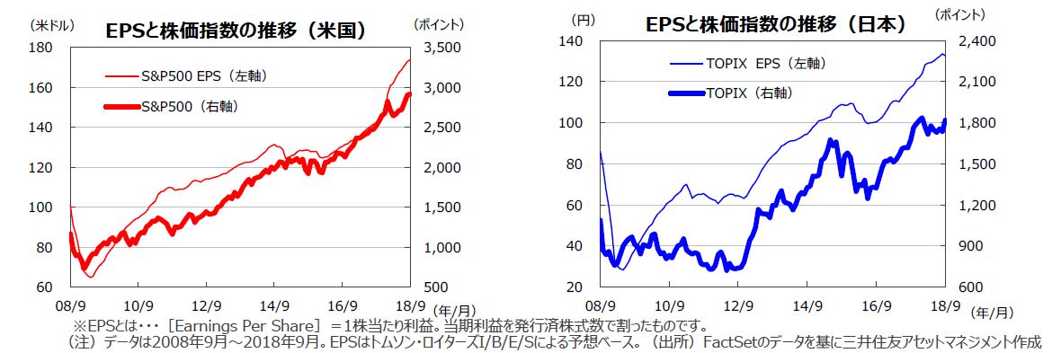 S&P500種指数の18年9月の1株当たり予想利益(EPS)は173.85米ドル(前年同月比+22.2%)と、23カ月連続で過去最高を更新し、かつ11カ月連続で前年同月比二桁の伸びとなりました。東証株価指数(TOPIX)の予想EPSは132.73円(同+13.0%)と、16カ月連続で二桁の伸びとなりました(いずれも予想はトムソン・ロイターズI/B/E/Sベース)。