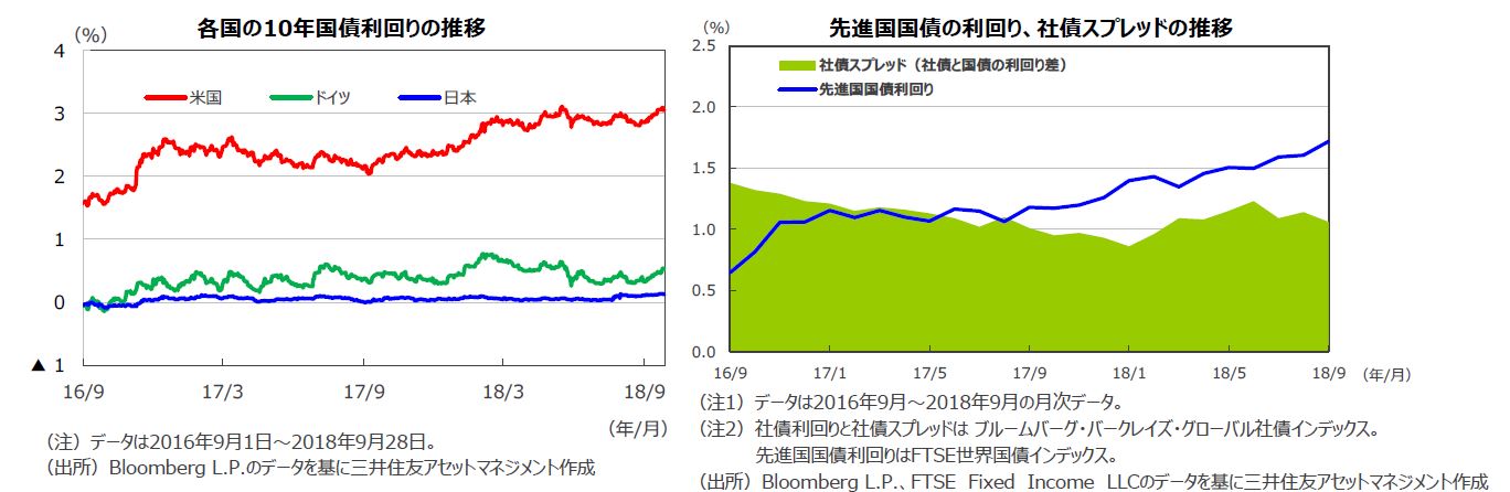 9月の米10年国債利回りは、前月末に比べ上昇しました。雇用統計やISM指数をはじめとして米景気が順調に拡大していることを示す景気指標の発表が相次いだこと、米中貿易摩擦への過度な警戒感が後退したこと、S&P500種指数やダウ平均が史上最高値を更新したこと等によるものです。欧州では、株高に加え、米金利の上昇、原油価格の値上がり等から、ドイツ10年国債利回りが上昇しました。日本でも、日米の株価上昇等により、長期債利回りが小幅ながら上昇しました。