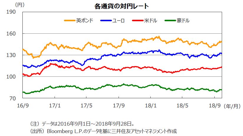 9月は、円が米ドル、ユーロ、豪ドルといった主要通貨に対して下落しました。世界的な株高を背景にリスク選好が強まったことや、欧米の債券利回りが上昇したこと、トルコ中銀が政策金利を大幅に引き上げたことを契機に新興国市場全般への懸念が後退したこと等によるものです。
