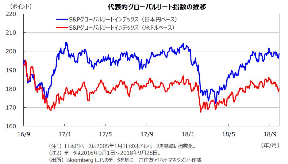 9月のグローバルリート市場は、日米豪といった主要国の長期金利上昇を受けて、下落しました。円ベースの月間下落率は、為替効果がプラスに寄与したため、ドルベースの下落率よりも小幅にとどまりました。