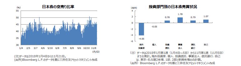 最後に、投資部門別の日本株売買状況を確認します。主要投資部門について、年初からの売買代金累計をみると、海外投資家の売り越しが4兆円を超え、突出した動きとなっています。一般に、日本株は海外投資家の動向に影響を受けやすい傾向があることを踏まえると、10月以降に日本株が調整色を強めたのも、海外投資家の売りが関係したと推測されます。この先は、やはり海外投資家の動向が焦点になりますが、すでに年初から大幅に売り越しているだけに、株価反転の際には、買い戻しの余力は十分あると考えられます。