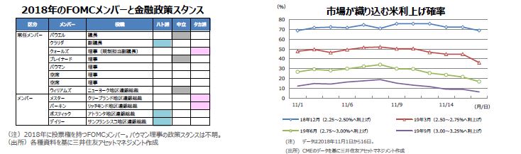 このところ、FRB高官から、利上げ継続に慎重ともとれる発言が相次いでいます。パウエルFRB議長は11月14日、米テキサス州ダラスで講演し、海外景気の減速や、米財政刺激効果の剥落、米利上げが時間差をもって経済に与える影響を潜在的な課題として列挙したうえで、「あとどれくらい利上げをするか、今後の利上げペースについて考えなければならない」と述べました。また、アトランタ地区連銀のボスティック総裁は11月15日にスペインの首都マドリードで開催された講演で、「(景気を刺激も抑制もしない)中立金利からあまりに遠く離れているとは思わない」と指摘しました。さらに、クラリダFRB副議長は11月16日、米CNBCのインタビューのなかで、米政策金利は「中立水準に近づいている」、「一部では減速しつつある世界経済も考慮に入れる必要がある」、ニューヨーク地区連銀のウィリアムズ総裁は11月19日、米ニューヨーク州ブロンクスで行われたイベントで、「われわれは若干の(somewhat)利上げを行う可能性が高い」と述べました。なお、パウエル議長、ボスティック総裁、クラリダ副議長、ウィリアムズ総裁は、いずれもFOMCにおける議決権を有しています。