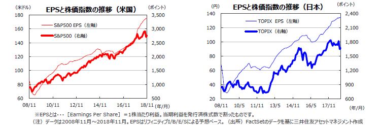 S&P500種指数の18年11月の予想1株当たり利益(EPS)は175.35米ドル(前年同月比+20.8%)と、25カ月連続で過去最高を更新し、かつ13カ月連続で前年同月比二桁の伸びとなりました。東証株価指数(TOPIX)の予想EPSは133.79円(同+10.4%)と、18カ月連続で二桁の伸びとなりました(いずれも予想はリフィニティブI/B/E/Sベース)。