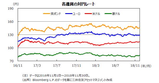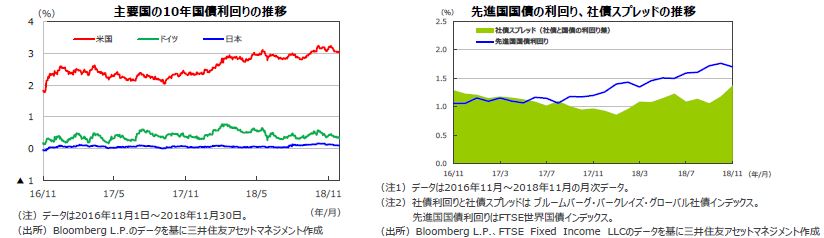 米10年国債利回りは、9月中旬に3%台に乗せ、11月8日には3.24%まで上昇しましたが、その後は低下基調を辿りました。11月上旬は10月の雇用統計で雇用者数が上振れたことや、FOMCにおいて利上げ継続の方針が確認されたこと等から、利回りは上昇しました。ところが、中旬以降は米景気指標の軟化、米株価や原油価格の下落、パウエル議長をはじめとするFRB高官のハト派的な発言を受けた利上げ観測の後退等により低下し、11月末の10年国債利回りは前月末より低い水準で引けました。欧州では、英国のEU離脱交渉を巡る不透明感が強まったこと、11月のドイツPMIが製造業、非製造業とも市場予想を下回ったこと等を受けて、ドイツ10年国債利回りは低下しました。日本の10年国債利回りも、米長期金利の低下や欧米株式市場の下落等により、低下しました。米国の社債については、国債との利回り格差が前月末に比べ拡大しました。
