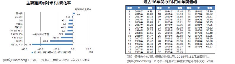 2018年のドル円相場を振り返ると、12月25日時点において、年初来安値(ドルの安値、円の高値)は3月26日につけた1ドル=104円56銭水準で、年初来高値(ドルの高値、円の安値)は10月4日につけた1ドル=114円55銭水準です。値幅は9円99銭と、わずかに10円を割り込んでいます。今年の金融市場では、貿易問題を巡る米中の対立などでリスク回避の動きが目立ったことを踏まえると、意外に小さい印象です。