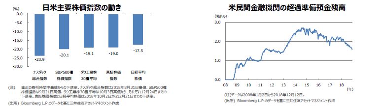 12月の米国株式市場は、S&P500種株価指数で前月比▲9.2%と大幅な下落となりました。月前半は、ファーウェイの副会長がカナダ当局に逮捕されたこと等から米中通商交渉への不安が広がり下落しました。後半にかけては、米連邦公開市場委員会(FOMC)後のFRB議長会見がタカ派的と受け止められたことや、米大統領の政権運営を巡る不透明感等からリスク回避の姿勢が強まり、下落に拍車がかかりました。一方、日本株式市場も、TOPIXで前月比▲10.4%と大幅な下落となりました。米中通商交渉への不安や世界的な景気減速、米国株式市場の下落が、重石となりました。