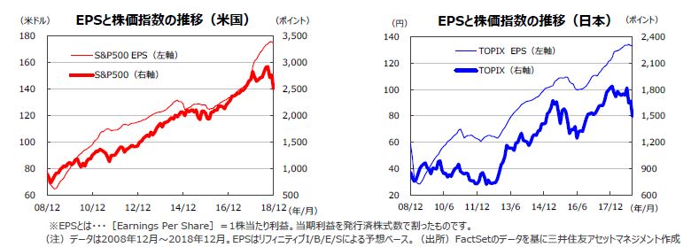 S&P500種株価指数の18年12月の1株当たり予想利益(EPS)は、173.96米ドル(前年同月比+18.0%)と、前年同月比では14カ月連続で2桁の伸びとなったものの、前月の水準には届かず、過去最高の更新は25カ月で終了となりました。東証株価指数(TOPIX)の予想EPSは、132.93円(同+8.9%)と、19カ月ぶりに1桁の伸びにとどまりました(いずれも予想はリフィニティブI/B/E/Sベース)。