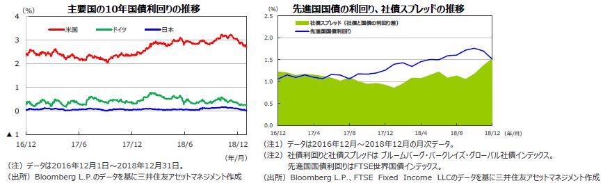 米10年国債利回りは、11月8日の3.24%を当面のピークとして低下基調に転じ、12月末は2.68%と2.7%を割込んで引けました。トランプ政権の通商政策が保護主義的な傾向を強めたこと等から、世界経済の先行きに対して不透明感が高まったこと、それにもかかわらず12月18日、19日に開催されたFOMCで、世界経済、物価動向を引き続き注視しつつも、「漸進的な利上げ路線は堅持」との方針が明示されたこと、世界的な株価や原油価格の下落に歯止めがかからなかったこと等によるものです。欧州でも、域内政治・経済動向の先行きへの警戒感が払拭されないなか、株価、原油価格の下落等を受けて、安全資産に対する需要が一段と強まり、ドイツ10年国債利回りは0.2%台前半まで低下しました。日本の10年国債利回りも、米長期金利の低下や欧米株式市場の下落等により、日銀の国債購入オペ減額にもかかわらず、低下しました。米国の社債については、「質への逃避」の動きの強まり等から、国債との利回り格差が前月末に比べ拡大しました。