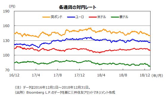 12月は円が米ドル、ユーロ、豪ドルといった主要通貨に対して上昇しました。世界的な株安に伴い、安全資産である円に対する需要が強まったことによるものです。その結果、米ドルの対円レートは、年末に109.69円と、半年振りに110円を割込みました。