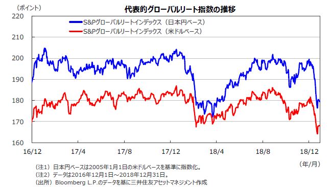 12月のグローバルリート市場は、主要国の株価急落を受けて下落しました。円ベースの月間下落率は、為替効果がマイナスに寄与したため、ドルベースの下落率を上回りました。
