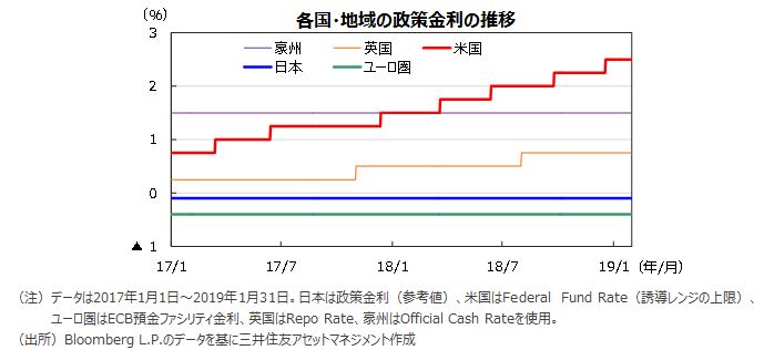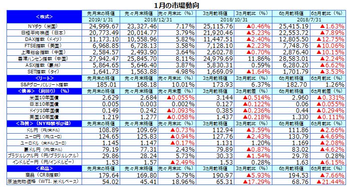 米国の株式市場は、昨年末の急落の反動に加え、米中通商交渉進展への期待、米国の金融引き締め終了観測の高まり等から、戻り歩調となりました。 欧州の株式市場は、米中通商協議に対する進展期待や米国の金融引き締め終了観測の高まり等から、上昇しました。 日本の株式市場は、米中通商協議の進展期待や、米国の金融引き締め終了観測の高まり等から、上昇しました。 |