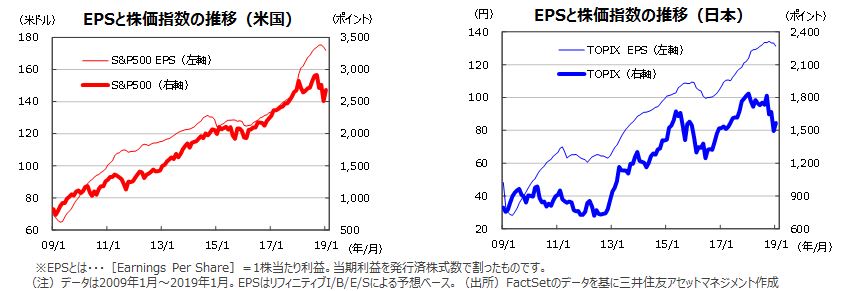 S&P500種指数の19年1月の1株当たり予想利益(EPS)は171.82米ドルでした。前年同月比の伸び率は+9.6%で、15カ月振りに1桁の伸びとなりました。東証株価指数(TOPIX)の予想EPSは131.37円(同+5.9%)と、前月の同+9.2%から更に伸び率が鈍化しました(いずれも予想はリフィニティブI/B/E/Sベース)。