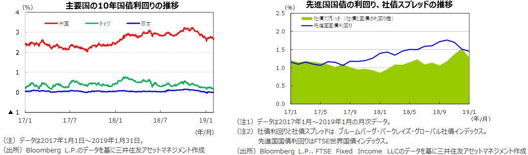 米10年国債利回りは、昨年来の株価調整を受け、年初1月3日に2.55%と約1年振りに2.5%台へ低下しましたが、中旬にかけて米政府が対中関税の引き下げを検討との報道を受け米中貿易摩擦の緩和期待が高まったこと等から2.78%まで上昇しました。下旬は米景気の減速懸念が浮上してきたうえ、FOMCメンバーから利上げに慎重な発言が発せられたこと等を受け、再び低下に転じ、月末は2.63%、前月末比0.05ポイントの小幅低下となりました。欧州では、米中貿易摩擦の緩和や合意なき英国のEU離脱回避への期待等から、ドイツ10年国債利回りが前半に0.28%近傍まで上昇しました。しかし、EUの景気後退懸念が台頭してきたうえ、ECBが域内景気の先行きに対して弱気の姿勢を強めたこと等により低下し、月末は0.15%で引けました。日本の10年国債利回りは、米長期金利の動向を睨みつつ、0.0%近傍での小動きとなりました。米国の社債については、国債との利回り格差が前月末に比べ縮小しました。