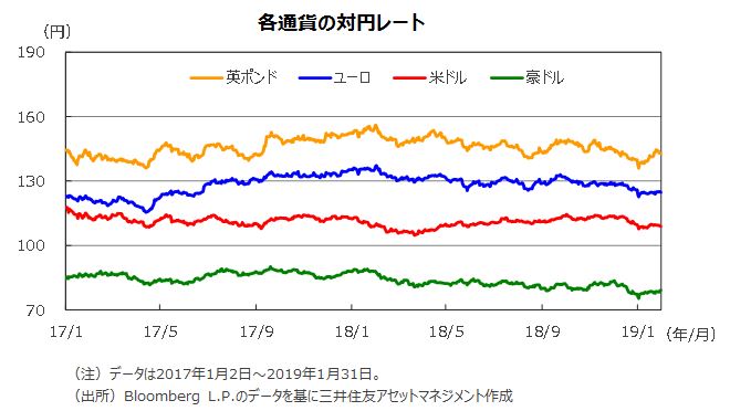 1月は、米ドル、ユーロに対して円は上昇しました。IMFが世界経済見通しを下方修正したことや、FRBやECBがハト派姿勢を強めたことなどが背景です。一方、豪ドル、英ポンドの対円相場は原油価格の上昇等を背景に上昇しました。