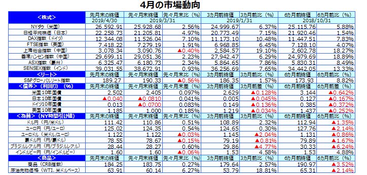 米国の株式市場は、中国の景気減速に底打ちの兆しが見られたことや、米国企業の好調な1-3月期決算を受けて上昇しました。 欧州の株式市場は、英国の欧州連合(EU)離脱が再延長され合意なき離脱が回避されたことや、中国の景気持ち直し期待などを受けて上昇しました。 日本の株式市場は、中国景気の持ち直し期待や、米国の株式市場が堅調に推移し、為替が円安に振れたことから上昇しました。 |