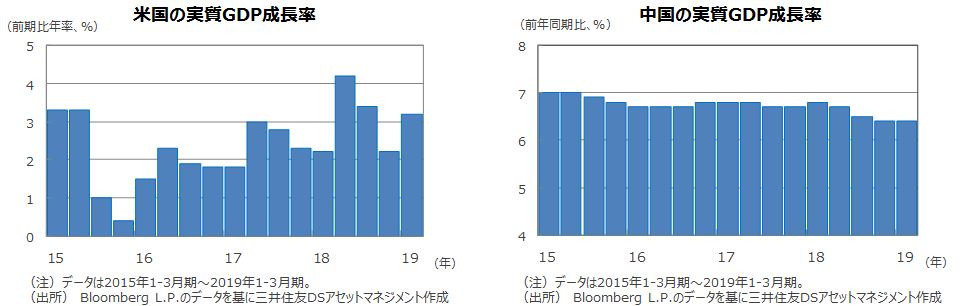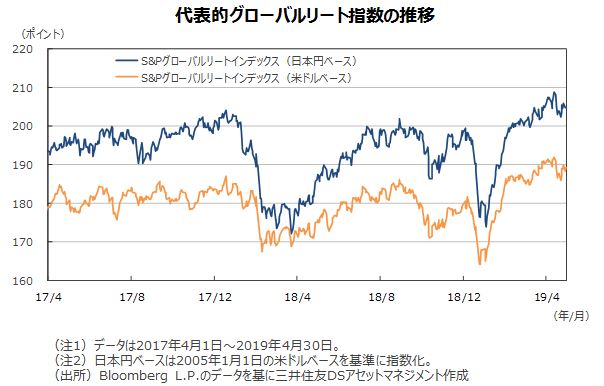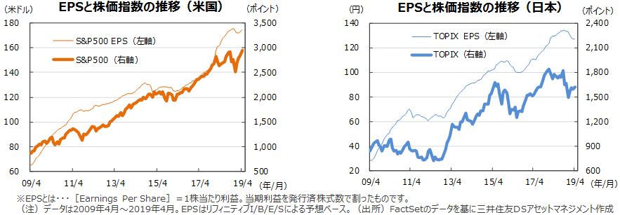 S&P500種指数採用企業のEPSは19年が前年比+3.0%、20年が同+12.1%です(19年4月30日発表、リフィニティブI/B/E/Sベース)。一方、日本の予想経常利益増益率は19年度(20年3月期決算)が前年度比+6.7%、20年度(21年3月期決算)は同+2.7%です(東証一部除く金融、QUICKコンセンサスベース、19年4月30日現在)。米国の予想EPSは前月比伸び率は鈍化したものの、1月を底に上昇に転じてきており、引き続き収益環境が改善するかが注目されます。一方、日本の予想EPSの改善は米国より後ズレしていますが、世界経済の回復期待からようやく底打ちの兆しが見え始めました。ただし、交渉が継続している米中通商協議は、その進捗が経済や金融市場に大きく影響するため注視が必要です。