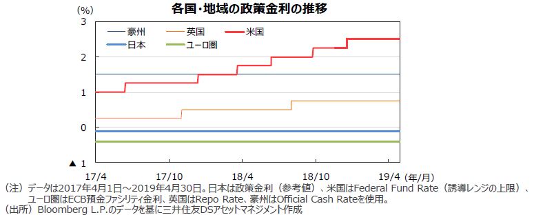 ユーロ圏では、製造業の弱さが長期化し経済の下押し圧力となっていることから、政策金利の引き上げは従来見通しより後ずれが見込まれ、預金ファシリティ金利の引き上げは2020年9月頃になると見られます。一方、主要リファイナンス金利は2020年も据え置かれると見られます。なお、量的緩和終了後もECBは再投資により、国債などの保有残高を維持する見込みです。