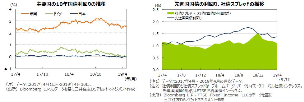 米国の長期金利は、米中などの好調な経済指標を受けて世界景気減速への懸念が和らいだことや、米国株式市場が堅調に推移したことから上昇しました。 欧州の長期金利は、予想を上回る中国やユーロ圏の1-3月期実質GDPなどの経済指標を受けて上昇しました。 日本の長期金利は、世界経済減速への懸念が和らいだことから前月末と比べて上昇したものの、月間を通じてマイナス圏で推移しました。 米国社債については、利回りを求める資金流入が継続し、国債との利回り格差が縮小しました。 |