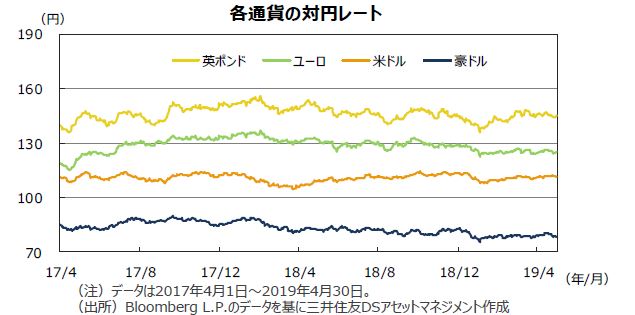 円は米ドル、ユーロに対して小幅に下落しました。中旬にかけて米中などの良好な経済指標を受けてリスク志向が改善したことから円が下落しましたが、日本の大型連休や、米国の重要経済指標発表、FOMCなど重要イベントを控えて月末にかけて円が買い戻されたことから、月間では対円でそれぞれ前月比0.51%、0.54%の下落となりました。一方、対豪ドルでは、4月のRBA理事会の議事要旨で、利下げが適切となるシナリオが議論されたことが明らかになったことや、1-3月期の消費者物価の伸びが鈍化したことなどから上昇しました。対英ポンドは、前月比0.57%下落しました。