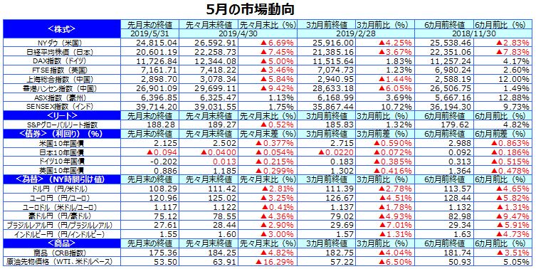 米国の株式市場は、米政府の対中追加関税引上げや、トランプ大統領のメキシコに対する関税引上げ表明など、貿易摩擦激化への懸念から大幅に下落しました。 欧州の株式市場は、英国の欧州連合(EU)離脱が混迷を深めていることや、貿易摩擦激化への懸念等から大幅に下落しました。 日本の株式市場は、貿易摩擦激化を背景とした世界経済減速懸念からリスク回避の動きが強まり、円高が進行したことから、大幅に下落しました。 |