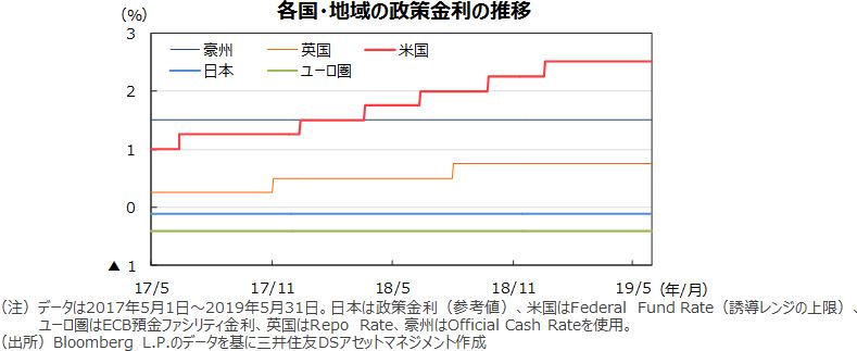 米国では、FRBは足元のコア物価の下振れは一時的なものであると見ていることから、当面は現行の政策金利を据え置くと見られます。ただし、中国やメキシコとの貿易協議の進展によっては想定以上の景気下振れのリスクがあるため、注視が必要です。