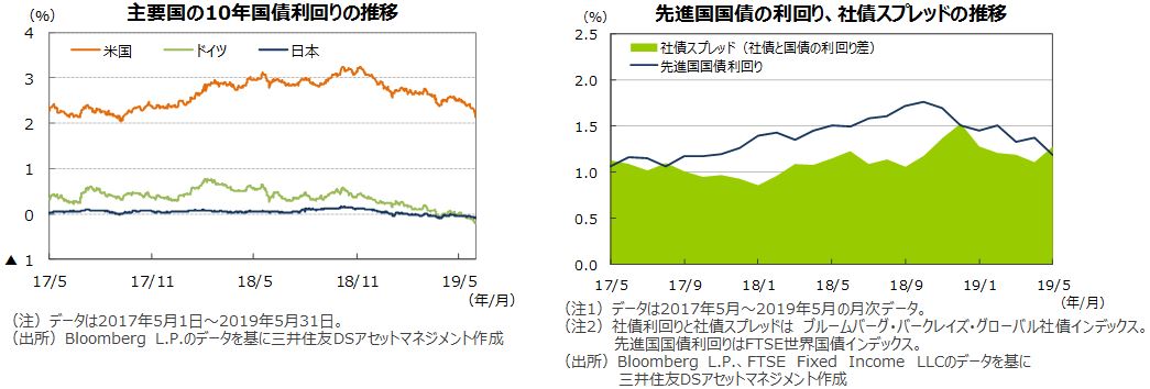 欧州では、米中貿易摩擦の激化を背景とした世界経済懸念や、英国のEU離脱を巡る混乱、欧州議会における反EU勢力の躍進などを受けてドイツの10年国債利回りが低下しました。 月末には米国とメキシコの貿易摩擦が懸念され、ドイツ10年国債利回りは一時過去最低水準まで低下しました。