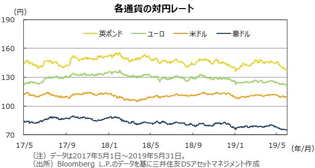 円は米ドル、ユーロ、豪ドル、英ポンドに対して上昇しました。米国が中国からの輸入2,000億ドル分に対し25%の追加関税引上げを表明したことをきっかけに米中貿易摩擦が再燃したことや、月末には新たにトランプ大統領がメキシコに対する追加関税を課すと表明したことから、月間を通じてリスク回避の動きが強まり安全通貨とされる円が買われました。英国ではメイ首相が保守党党首辞任を表明し、EU離脱が混迷の度合いを増していることからポンドが大幅に下落し、前月末比▲5.83%となりました。また、豪州ではRBAの利下げ観測が高まったことから、豪ドルが大幅に下落し、前月末比▲4.36%となりました。