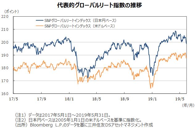 グローバルリート市場(米ドルベース)は、貿易摩擦激化の懸念によるリスク回避ムードの高まりを受けて下落しました。ただし、主要国の長期金利が低下したことがリート市場の下支えとなったほか、リートのディフェンシブ性が評価され、下落幅は前月比で▲0.52%にとどまりました。一方、円ベースの月間変化率では、安全通貨とされる円が買われたため為替はマイナスに寄与し、同▲3.02%となりました。
