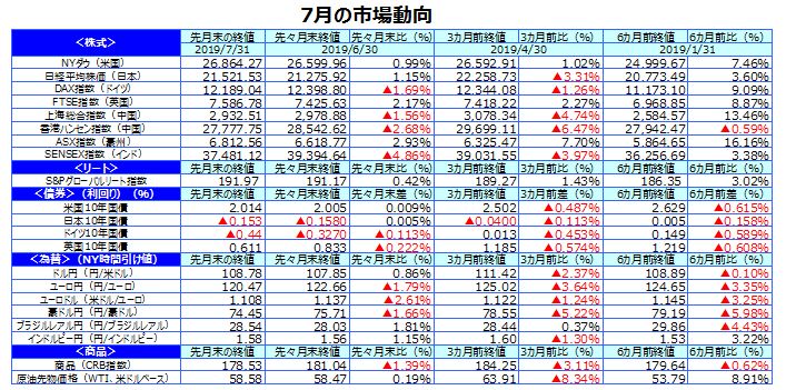 米国の株式市場は、米連邦準備制度理事会(FRB)による利下げ期待や、主要企業の堅調な企業業績を受けて上昇しました。 欧州の株式市場は、英ポンド安が進んだことから英国株式市場が上昇したものの、ユーロ圏経済の先行き不透明感等からドイツ株式市場は下落しました。 日本の株式市場は、企業決算を控えた警戒感や日韓の関係悪化を懸念して下落する場面もありましたが、堅調な米国株につれて上昇しました。 |